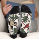 These winter forest animal socks feature a hand-illustrated pattern in black ink by Nathalie Portet, capturing the enchanting spirit of winter with depictions of squirrels, leaves, acorns, berries and mushrooms.