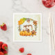A paper napkin with a cute squirrel standing behind some orange watercolor pumpkins. A foliage wreath surrounds them with an oak leaf and orange flowers and other sprigs and leaves. Background is a vintage parchment digital image.