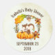 Save the date sticker personalised with your event name and date. Designed with a cute squirrel standing behind some orange watercolor pumpkins. A foliage wreath surrounds them with an oak leaf and orange flowers and other sprigs and leaves. Background is a cream colour, with a rough aged look around the edges.