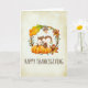 A happy thanksgiving folded greeting card. Designed with a cute squirrel standing behind some orange watercolor pumpkins. A foliage wreath surrounds them with an oak leaf and orange flowers and other sprigs and leaves. Background is a faux vintage parchment in a cream colour, with a rough aged look. Personalised message on the inside.