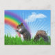 An awesome surreal photo illustration of a happy squirrel against a blue sky with rainbow.