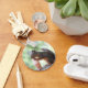 Photo of a squirrel eating an ice cream cone outside on the wooden railing of a back deck. The squirrel is licking a fake cone with what looks like strawberry ice cream...or maybe it's peanut flavored ice cream! A lovely soft green background of evergreen trees contrast with the pink ice cream cone. A funny squirrel picture that anyone who love squirrels or ice cream would enjoy!