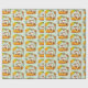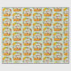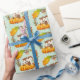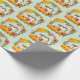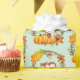 Wrapping paper with a cute squirrel standing behind some orange watercolor pumpkins. A foliage wreath surrounds them with an oak leaf and orange flowers and other sprigs and leaves.