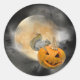 A squirrel climbs a Halloween jack-o-lantern in front of a misty full moon. A great sticker to pass out to trick-or-treaters.