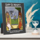 A plaque with a funny cartoon about a squirrel trying to get into a bird feeder. Original artwork by DBcartoons.