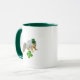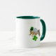 A a cute leprechaun squirrel holds a four leaf clover. This Irish mug would be fun for Saint Patrick's Day.