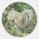 This cute set of round stickers features a photograph of a cute fluffy grey squirrel clutching an acorn and sitting in a tree in the forest.