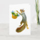 A happy squirrel carries a basket with green grass, blue flowers and a speckled quail egg on this Easter or spring card.