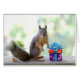 A squirrel poses between two brightly-wrapped presents in this original photograph.