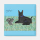 Mister Squirrel in deep conversation with pop and pup black German shepherds.