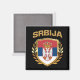 The national flag of Serbia is infused into a faux gold shield shape which itself, rest upon faux gold laurel leaves, The name of the country is added above the image.