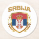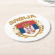 The national flag of Serbia is infused into a faux gold shield shape which itself, rest upon faux gold laurel leaves, The name of the country is added above the image.