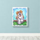 Animal Parade Cute St. Bernard Dog Canvas Print created by Imagine That! Design features our cute tan and white dog character standing in a grassy yard with a red brick fence, a textured blue sky and a playful wavy purple border painted by our talented children's book artist, Traci Van Wagoner. The fun pup stands in play position with one paw raised. This fun pet art is perfect for St. Bernard dog lovers and humourous animal art lovers of all ages. On many of our whimsical St. Bernard doggy products you'll find this cute puppy coming and going with the playful Saint Bernard dog's head on one side and the funny dog's tail on the other. Join the Animal Parade and bring a smile to the face of someone you love with a gift of our cute St. Bernard dog. Woof!