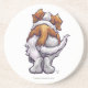 Animal Parade Cute St. Bernard Dog Sandstone Drink Coaster created by Imagine That! Design features our cute tan and white dog character standing in a grassy yard with a red brick fence, a textured blue sky and a playful wavy purple border painted by our talented children's book artist, Traci Van Wagoner. The fun pup stands in play position with one paw raised. This fun pet art is perfect for St. Bernard dog lovers and humourous animal art lovers of all ages. On many of our whimsical St. Bernard doggy products you'll find this cute puppy coming and going with the playful Saint Bernard dog's head on one side and the funny dog's tail on the other. Join the Animal Parade and bring a smile to the face of someone you love with a gift of our cute St. Bernard dog. Woof!