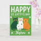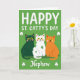 This greeting card shows three cartoon cats lined up across the lower middle, leaning close as if they’re sharing an inside joke, with a deep emerald-green cat on the left, a white cat with lime-green spots in the center, and a warm orange cat on the right 💚. Their wide yellow eyes, tiny smiles, and rosy cheeks make them look like friendly companions posing together for a holiday photo. The background is a solid, rich green that sets a St. Patrick’s Day scene without any extra clutter. Near the top, large white text reads “HAPPY ST. CATTY’S DAY,” spaced evenly and easy to spot against the green. In the corners, small white shamrocks add a simple festive touch ☘️. Centered near the bottom, the word “Nephew” appears in white, sitting beneath the cats like a neat label. The white cat’s lime-green polka dots stand out as the main pattern detail, tying the trio into the green setting.