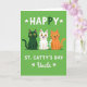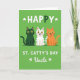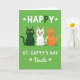 Designed with three stylized cats lined up in a neat row on a deep green background, the scene feels festive and friendly 💚. On the left sits an emerald-green cat with shining golden eyes, angled slightly toward the others as if keeping close. In the center, a white cat dotted with green polka dots grins with an open mouth, leaning into the group like a cheerful friend. On the right, a warm ginger cat faces inward too, its relaxed posture echoing the easy closeness between the trio ☘️. Across the top, large white text reads “HAPPY,” with small white shamrocks tucked around the letters, and the “P” is a darker green that matches the left cat. Below the cats, the line “ST. CATTY’S DAY” appears in white, with “Uncle” set beneath it, also in white, with more tiny shamrocks as accents. The cats are outlined with simple, crisp lines, and the green background stays solid and even behind them.