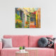 This colourful stretched canvas print features an adaptation of a fine art painting of a small street in St. Croix, Virgin Islands, by the American artist, Anna Unterman.  The bright, sunny scene is a riot of colours.  There is a red, pink and magenta bougainvillea vine over the archway as well as  orange flame vines and other green shrubs and leaves.  The colourful buildings are yellow, gold, blue and green.  Reprinted with permission from the estate of Anna Unterman. All rights reserved.