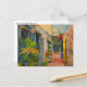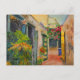 This colour postcard features an adaptation of a fine art painting of a small street in St. Croix, Virgin Islands, by the American artist, Anna Unterman. The bright, sunny scene is a riot of colours. There is a red, pink and magenta bougainvillea vine over the archway as well as orange flame vines and other green shrubs and leaves. The colourful buildings are yellow, gold, blue and green. Reprinted with permission from the estate of Anna Unterman. All rights reserved.