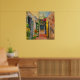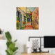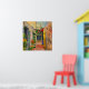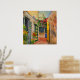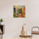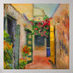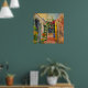 This poster features an adaptation of a fine art painting of a small street in St. Croix, Virgin Islands, by the American artist, Anna Unterman. The bright, sunny scene is a riot of colours. There is a red, pink and magenta bougainvillea vine over the archway as well as orange flame vines and other green shrubs and leaves. The colourful buildings are yellow, gold, blue and green. Reprinted with permission from the estate of Anna Unterman. All rights reserved.