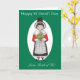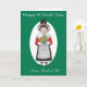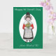 A St David's Day greeting card "from Both of Us", with a little girl wearing the national costume and holding a bunch of daffodils. From a handpainted illustration by Judy Adamson.