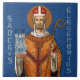 St. Eleutherius was a sixth-century prelate, the first bishop of Tournai. He evangelised the pagan Franks of the region, then Gaul now Belgium. He vigourously argued against Arianism, a rampant anti-trinitarian heresy of the time that denied the divinity of Christ and asserted that Jesus was created by and not of the same substance as God the Father. According to tradition, St. Eleutherius was a martyr: he was set upon by a group of Arians as he left his church, beaten, and left for dead; he died some weeks later of the wounds he sustained in the attack c. 532. + Here, St. Eleutherius--like any other bishop saint--is dressed in episcopal robes and holds a crosier, symbol of his authority. His distinguishing attribute is the five-spired cathedral that he holds in his right hand. The cathedral model is readily identifiable by its spires as the present-day Cathedral of Our Lady (in English; Notre-Dame de Tournai in French; and Onze-Lieve-Vrouw van Doornik in Dutch). Begun in the 12th century long after the Saint’s demise, the building rests on much older foundations and combines features of three distinct styles and construction phases: the Romanesque, the Gothic, and the French Baroque. Today, the Cathedral houses relics of St. Eleutherius in a gabled silver and gilded copper chest adorned with sculptures in very high relief. The reliquary shrine was commissioned by Bishop Walter de Marvis of Tournai, and completed in 1247, on the occasion of the retranslation of the Saint’s relics. It is one of the masterpieces of Gothic metalwork. + Feast: February 20 +