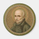 Spanish Basque nobleman and soldier turned priest and theologian, St. Ignatius Loyola (1491-1556) was founder and first Superior General of the Society of Jesus (the Jesuits). In this roundel, St. Ignatius is clad Jesuit style. He wears a simple black cassock, presumably wrapped and cinctured at the waist not buttoned down the front, and a collared black cape. On his chest, the Saint wears a Christogram, the official emblem of the Jesuits: the IHS monogram with the H surmounted by a cross above three nails and surrounded by a Sun. IHS (or iota-eta-sigma) stands for first three letters of the name of Jesus in Greek; the three nails, for the Passion; and the Sun, for the Son of God. Bound by a vow of special obedience to the Pope, the Jesuits undertook missionary work and education in orthodoxy under papal directives, playing an especially important role in the Counter-Reformation. The Jesuits’ motto in Latin coined by their founder is “Ad maiorem Dei gloriam (abbreviated AMDG)” and means "For the greater glory of God". + Feast: July 31 + Image Credit (BK 050): Antique image of St. Ignatius de Loyola, S.J., originally published in chromolithography by B. Kühlen, Mönchengladbach, Germany, unnumbered Jesuit Series, late 19th century, from the designer’s private collection of religious ephemera.