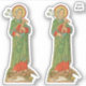 Here, a mature, grey-haired St. Joseph stands atop a globe. He is richly garbed in strong colours. His robe is red; his mantle, green with a dark aqua lining and golden yellow borders. He holds a spray of white lilies symbolising purity in his right hand and an L-shaped brown wooden carpenter’s rule indicative of his profession in his left. Beneath St. Joseph’s sandaled feet are a small dragon, a crown, a scroll, and the globe which is inscribed with the names of the populated continents—Asia, Australia, (North and South) America, Africa, and Europe. The dragon and the scroll represent threats to the Church. The dragon signifies Satan; the scroll, heresies by being a précis of Blessed Pope Pius IX’s 1864 Syllabus of Errors, a document articulating 19th-century philosophical and political positions hostile to Catholicism. The scroll reads: Non serviam (“I will not serve”) / Atheismus (Atheism) / Odium Ecclesiae (Hatred of the Church) ~ S. Pontifice (The Pope) ~ Episcopi (Bishops) ~ Presbyteri (Priests) / Liberalism. The phrase “Non serviam”, that is, “I will not serve”, is attributed to Satan who rejected God and was banished from heaven. Atheism, Anticlericalism, and Liberalism are self-explanatory and were movements that shaped Pius IX’s policies, especially regarding the unification of Italy and its rise as a modern nation-state. The towering figure of St. Joseph stamps out heresy and tramples underfoot Satan’s power over the world by crushing the dragon beneath his feet toppling the crown from the dragon’s head. + A much more elaborate, near-contemporary variant was issued as a black and white lithograph. (Compare our DT 01.) Like the black-and-white litho, this chromo- or colour lithograph was published to promulgate Pope Leo XIII’s “Prayer to St. Joseph” of 1889. + Principal Feast of St. Joseph: March 19; Feast of St. Joseph the Worker: May 1 + Image Credit (VVP 09): Figure extracted from an antique chromolithograph of Saint Joseph, Protector of the Church, Pray For Us [H. Jozef, beschermer der H. Kerk, B.V.O.] originally published by K[arel] v[an] d[er] Vyvere-Petyt, Bruges, Belgium, c. 1890, from the designer’s private collection of religious ephemera.