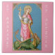 According to tradition, St. Margaret (or St. Marina the Great Martyr) laid down her life for Christ during Diocletian’s persecution at the beginning of the fourth century. Though a famous virgin martyr, ironically she is patron saint of expectant mothers and women in labour. The devil in the guise of a dragon, as this unusual patronage’s origin story goes, swallowed her whole. However, the cross she was carrying so irritated the dragon’s innards that he either egested her or ruptured to be rid of her. While even Mediaeval popes and hagiographers deemed this story fanciful, nevertheless, it was embraced by the laity and by artists if only for its symbolism. And, the cross and the dragon have been her principal attributes ever since. + This image of St. Margaret is particularly fetching. The saint, whose beauty was legendary, stands on the back of a large green dragon that tugs at her cloak with its teeth. She is crowned with a garland of roses, her long blonde hair flowing over her shoulders. She wears a bright pink mantle over a white tunic against a blue background patterned with little white dots and stars. + This product line emphasises St. Margaret’s patronage of pregnancy and childbirth. The dominant pink and blue colour scheme ties in well with the modern custom of using these colours for girl and boy babies. The mantle’s golden yellow lining allows for a gender-neutral theme. + Feast: July 20 +