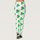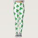 These St. Patrick’s Day leggings feature a bold all-over shamrock pattern set against a clear white background, creating a striking contrast that immediately stands out. The clovers are rendered in a green faux glitter effect, giving the appearance of sparkle while remaining smooth and comfortable to wear.