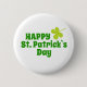 St Patrick's day button with a green shamrock. Green Happy St. Patrick`s day text. For your St. Patrick`s day party or a perfect gift.