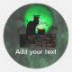 A silhouette of Théophile Steinlen's black cat for the Le Chat Noir club in a modern setting for St. Patrick's Day featuring the cat with green eyes, a green full moon, a vine with shamrocks, and a pot of gold.