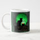 A silhouette of Théophile Steinlen's black cat for the Le Chat Noir club in a modern setting for St. Patrick's Day featuring the cat with green eyes, a green full moon, a vine with shamrocks, and a pot of gold.