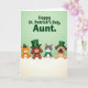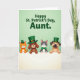 This greeting card features a soft light-sage gradient background with dark green text across the top that reads, “Happy St. Patrick’s Day, Aunt,” centered and easy to spot. Below the message, four cartoon-style animals—two cats and two dogs—peek over a cream-colored horizontal panel as if they’ve gathered close to greet her together. Their wide eyes and small smiles feel like a friendly, affectionate exchange, like they’re sharing a sweet inside joke 💚. Three of them wear tiny green top hats with little golden buckle details, tying the group neatly into the St. Patrick’s Day theme ☘️. The fourth is a gray cat wearing a green bow tie, adding a slightly dressy touch beside the others. The characters are drawn with smooth shading and simple lines, keeping the scene calm and cozy. The cream panel spans the lower part of the design, with the four faces and hats lined up above it in a neat row.