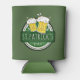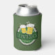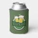 Festive can cosy with a drawing of two beer mugs with foam, on a circle with the words "St. Patrick's Day". Design on both sides. Background colour customisable.