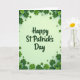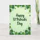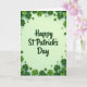 This design shows a soft mint background with a loose frame of clovers in many shades of green, giving the scene a gentle St. Patrick’s Day mood. In the center, the words “Happy St Patrick’s Day” sit prominently in dark emerald green lettering, sized larger than everything else so your eye lands there first 💚. Around the text, three-leaf and four-leaf clovers tilt in different directions, like they’ve drifted into place together, close enough to feel like a friendly embrace. The larger clovers anchor the corners while smaller ones trail along the sides, creating a natural flow that feels a bit like two people circling back to each other in a quiet, affectionate dance ☘️. Each leaf has soft highlights and light shadowing underneath, adding depth as if the clovers are resting lightly on the card. The greens range from deep forest to softer leaf tones, keeping the border lively without overwhelming the message. A few tiny clovers are scattered between the bigger shapes, and the asymmetrical arrangement leaves open space so the center text stays clear and easy to read. The clover leaves show gentle contours and a faint sheen, with shadows that fall subtly onto the pale mint surface.