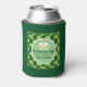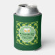 A St. Patrick's Day can cooler which says official drinking team with a personalised name. Illustrated with 2 mugs of beer inside a green circle. A repeating pattern with clovers in the background.