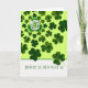 Happy St. Patrick's Day paper greeting card written in Korean. Blank inside for your personal message. Clovers, shamrocks floral arrangement with a white clover flower in the centre of the design. Shades of green colours with white and text written in dark green. Art, image, and verse copyright © Shoaff Ballanger Studios, 2021.
