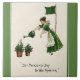 A woman, wearing a green dress with a white apron, is watering potted shamrock plants with a green watering can. She is standing next to a green harp flag of Ireland. Greeting: St. Patrick's Day in the Morning. Image of a vintage St. Patrick’s Day postcard with a custom green border.