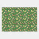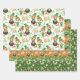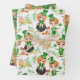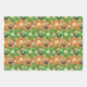 This set of wrapping paper features a lad and lass dressed in green with hats, with a pot of gold, a lucky horseshoe, and a cute orange cat. In different designs on a white background, a green background, and an orange and green background. This would especially be cute to wrap a child's gift.
