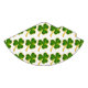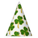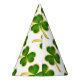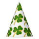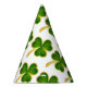 These paper party hats have a gold-coloured-outlined green shamrocks slathered all over from front to back over white background.