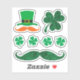 Fun St. Patrick's day sticker pack featuring a green leprechaun hat with ginger moustache, green glitter shamrock and moustache (printed images) and four green clovers.