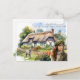 St. Patrick's Day postcard featuring a watercolor illustration of a charming Irish cottage with a thatched-roof, white exterior with green shudders and wooden beams surrounded by a colourful Irish country garden. A large Irish Wolfhound stands prominently near the entrance. In the bottom right foreground, a young Irish woman wearing a green flat cap, a tweed jacket, and a light scarf, evoking a traditional Irish countryside look.