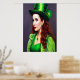 A young lady with long red hair wearing green clothes and a big green hat. This is a AI generated art.