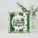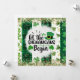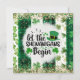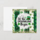 This holiday card exudes festive St. Patrick's Day cheer with its vibrant and playful design. The background is composed of alternating vertical stripes featuring green plaid and various shades of green shamrocks and clovers. Glittery gold confetti decorates the top and bottom edges, adding a celebratory touch.