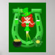 St Patrick’s Day Redheaded Girl Leprechaun is holding green beer and stands next to a pot of gold and a lucky green horse shoe!