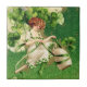 Tile with a lovely Irish lass who is not afraid to fly up into the air on a pipe with green ribbon for harness. Surrounded by clovers she is a dashing St. Patrick's Day greeting.