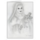 A beautiful black and white pencil sketch of a robed Saint Therese holding a rugged cross and flowers in her hands.