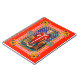In this glorious representation, St. Thomas Becket, Archbishop of Canterbury, stands before an altar dressed for Mass. The altar is probably intended for St. Benedict’s near which—not at which--he was assassinated on 29 December 1170. It is a formal portrait, that is, the subject appears posed. Becket wears a bright red chasuble over a blue-green dalmatic and white alb. Over the chasuble, he wears his metropolitan pallium—a garment symbolic of his office as an archbishop who presides over an ecclesiastical province composed of several dioceses. The pallium is ornamented with 11 visible patée crosses rather than the more usual 5 visible crosses. (During the Middle Ages there was no definite rule regulating the number of crosses used.) St. Thomas cradles his mitre in the crook of his right arm and carries his archiepiscopal cross in his left hand. A gash in his forehead, a palm of martyrdom, and the blood-red chasuble in the liturgical colour for martyrs allude to his assassination. There is not a sword in sight—not even one laying on the floor at his feet. His name in Latin (Thomas Cantuariensis, that is Thomas of Canterbury) vertically flanks his figure in the aqua and sapphire blue chequered background. The whole is contained in a framework of Celtic design. +