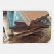 Stack of books on old chair tea towel