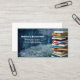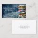 A stack of books stand on the right side of this design, over a blue toned grunge background. Your name, title and contact appear in bold white letters on the left. This business card design is especially suited for those in the education or academic business or industry.